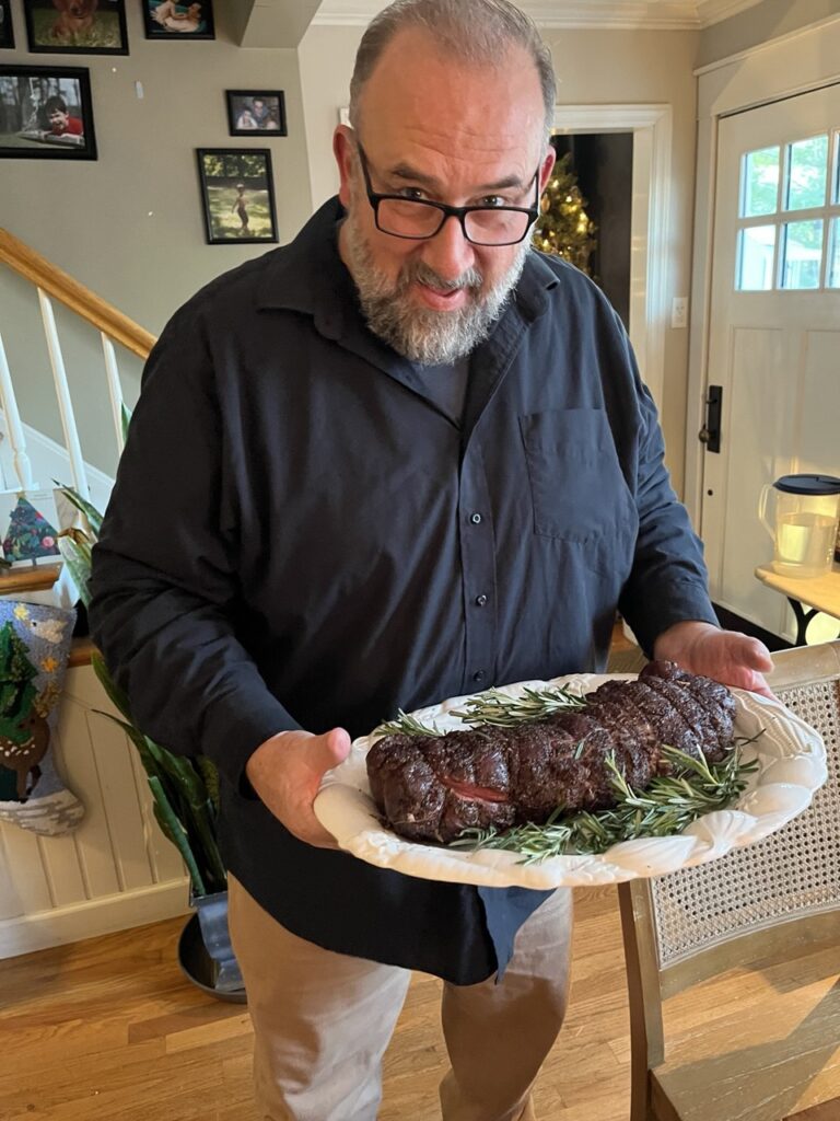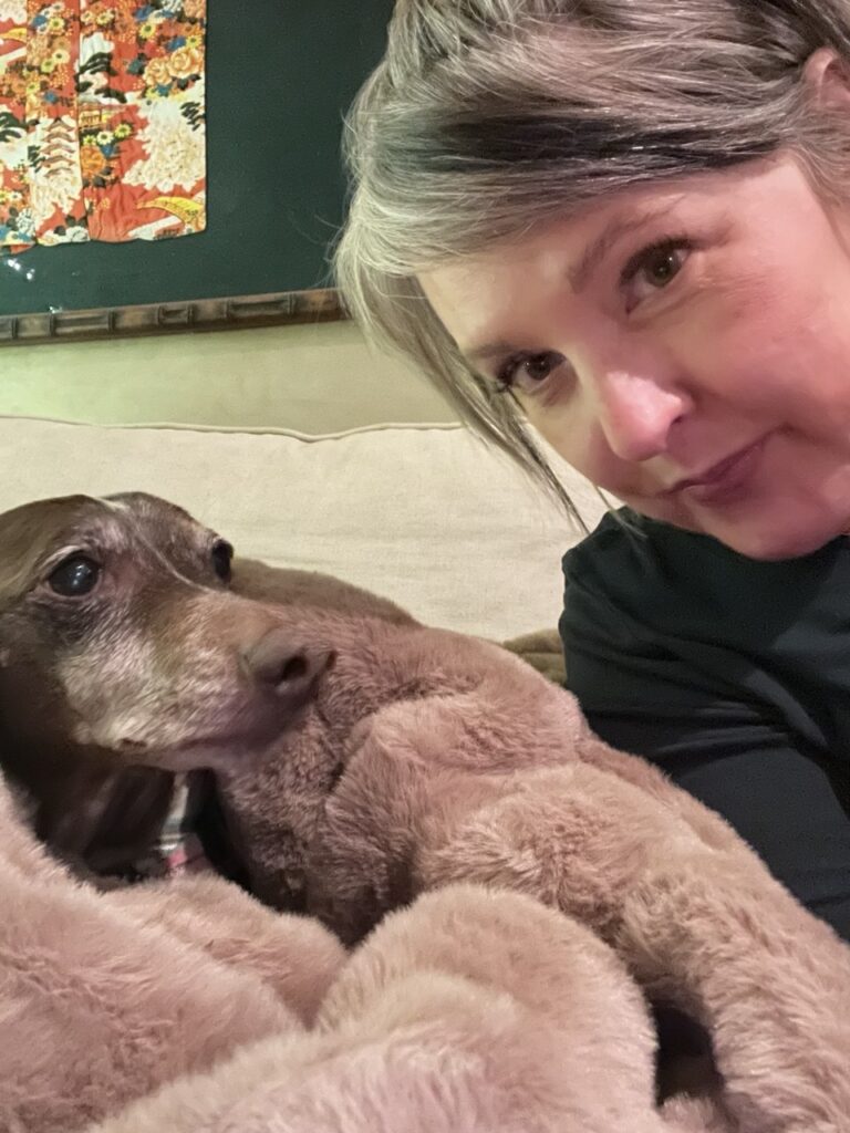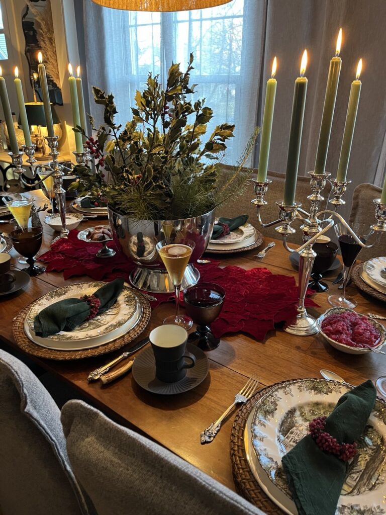 Holly’s Christmas table, Tenderloin Tim, Holly’s furry blanket, and the pharmacy tree